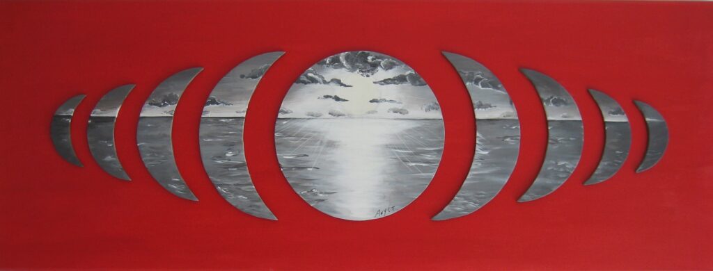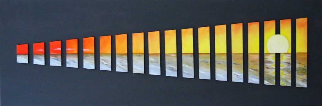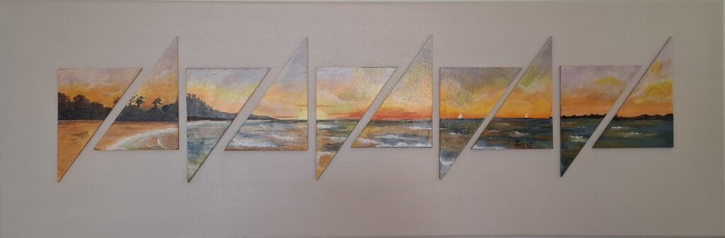 C’est un coucher de soleil très coloré, en forme de triangle pour changer. Je recherche l’originalité, et je n’aime pas avoir deux tableaux pareils. Il faisait beau à Billiers (Morbihan) ce soir là.
